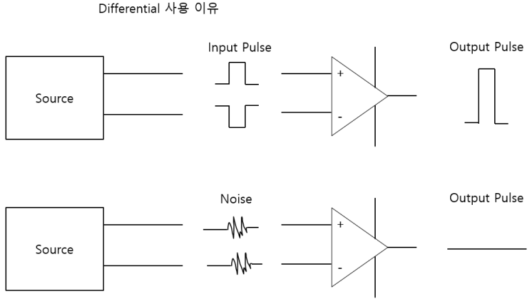 신호의 위상이 반대이기 때문에 노이즈 제거에 유리 → 노이즈의 경우 동일위상으로 입력되기 때문