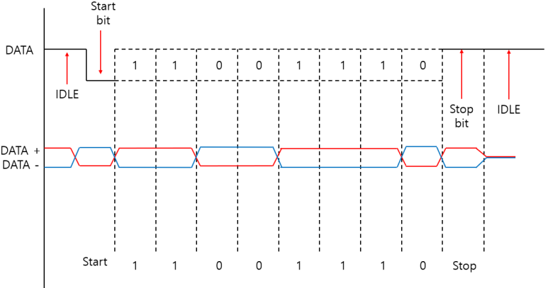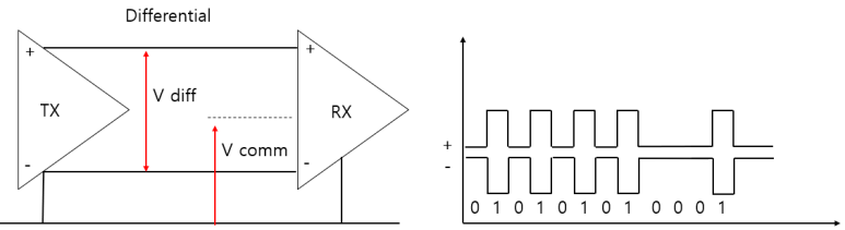 - 최대 속도와 길이를 늘리기 위해 각 신호를 2개의 차동신호를 사용해 전송함