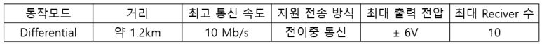 - 긴 통신 거리(1.2km)와높은전송속도(10Mbps)를 지원하며, 차동 신호 방식을 사용해 노이즈에 강하기 때문