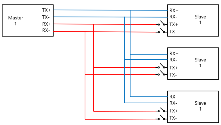 - Master는 RS-422 디바이스를 사용하고, Slave는 RS-485 디바이스를 사용