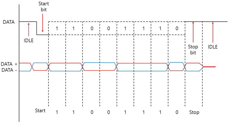 - 해당 라인을 통하여 송,수신이 이루어지며 반 이중 통신(Half-Duplex)를 기본으로 통신
