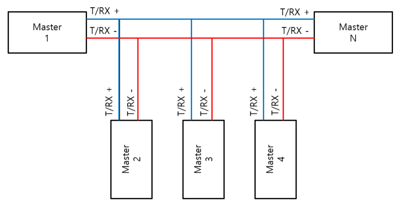 - 2선식 방식은 TX+ 와 RX+, TX- 와 RX- 를 두 가닥의 전선(Twisted Pair)으로 연결하여 통신하며, 모든 디바이스가 마스터(Master)로서 멀티 마스터 구조로 운영됨