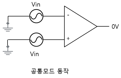 - 동일한 입력 신호값이 양쪽 입력에 가해질 때 출력은 상쇄되어 0V