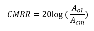 - 공통모드 이득(Acm)에 대한 개루프 전압이득(Aol)의 비, 즉 Aol / Acm 은 원하지 않는 신호를 제거하는 관점에서 연산증폭기 성능을 결정짓는 중요한 기준이며 이를 공통모드 제거비(CMRR)라 함